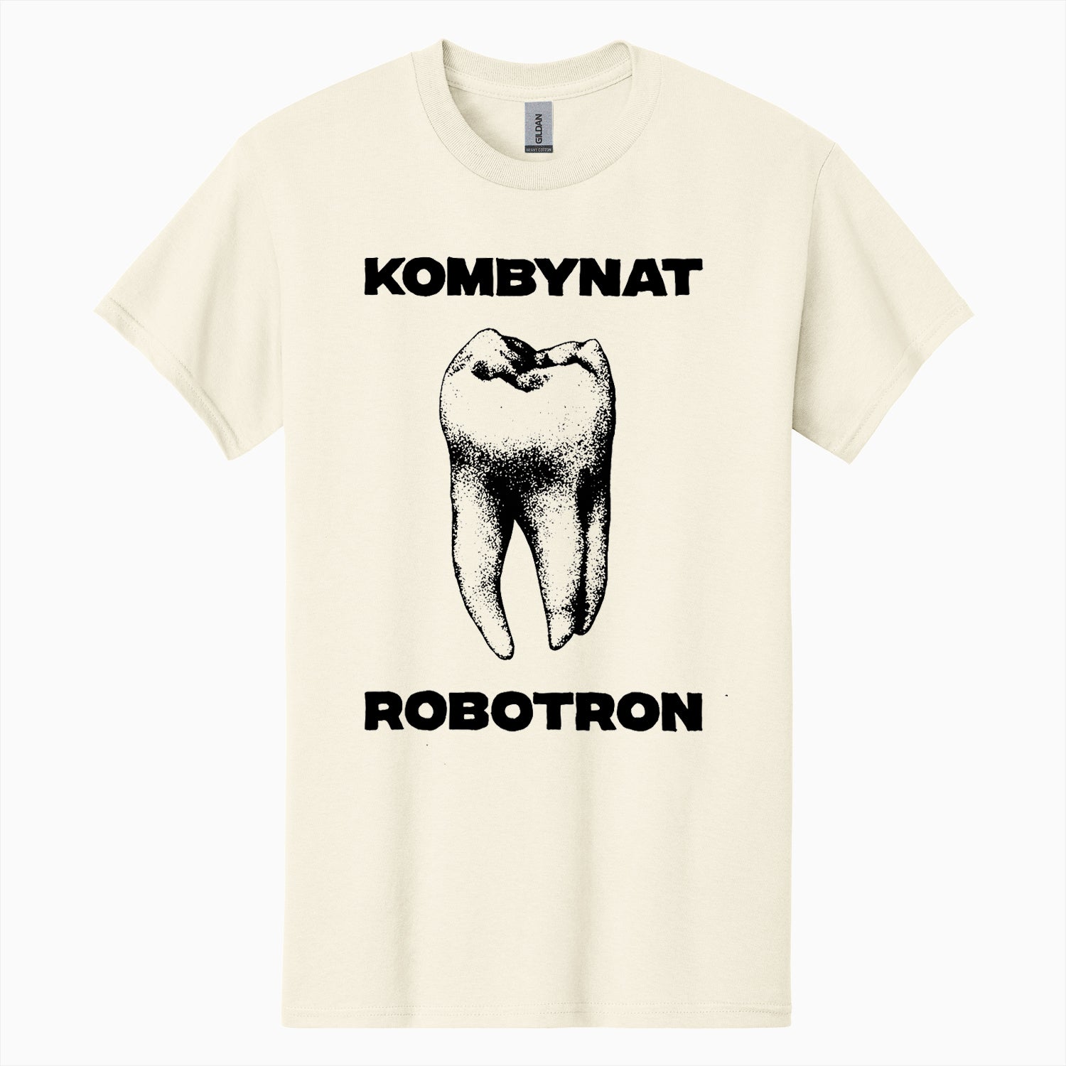 Official Kombynat Robotron merchandise. Screen-printed on off-white / natural Gildan Heavy Cotton unisex short-sleeve t-shirts. Limited stock.