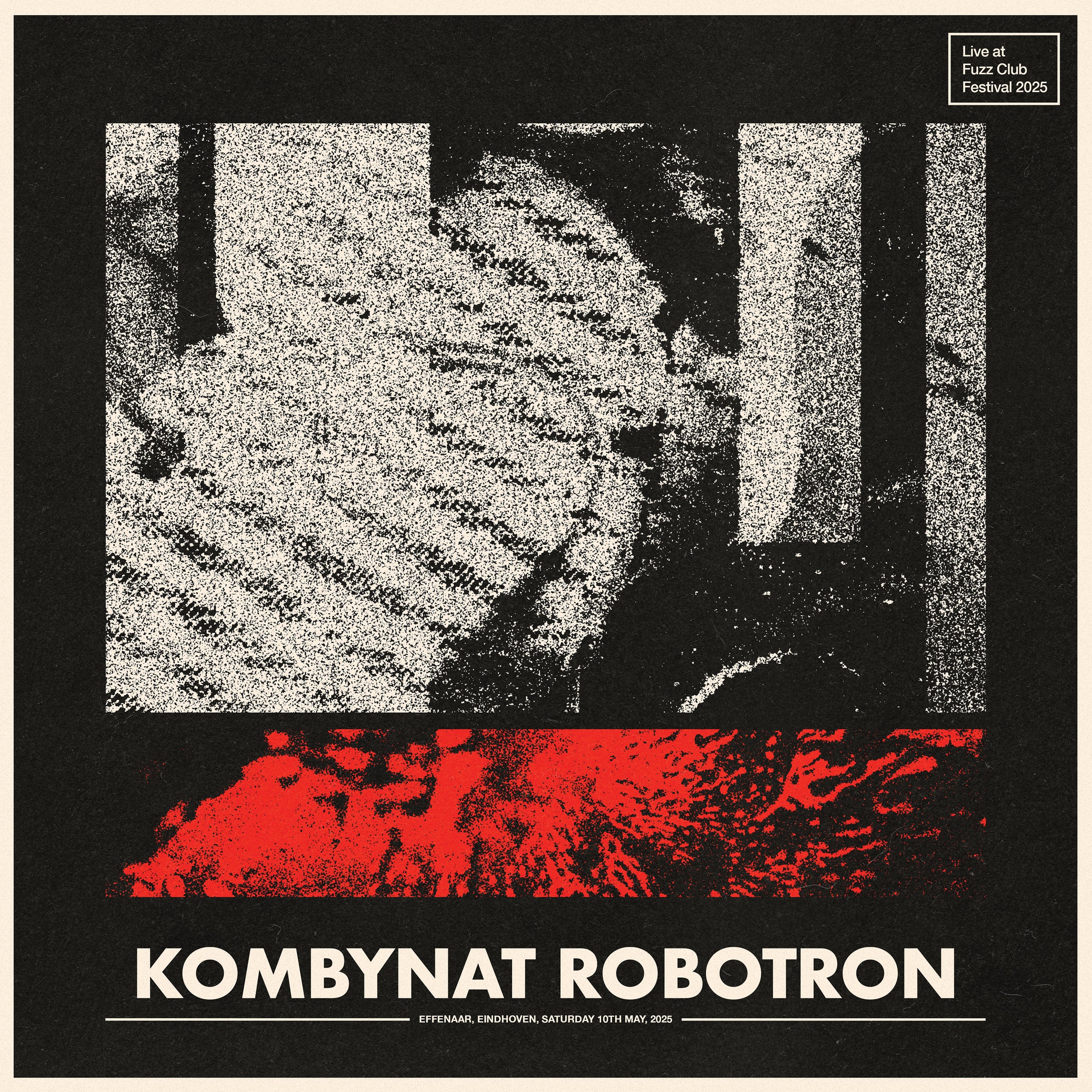 Kombynat Robotron's set at the 2025 Fuzz Club Festival now available on 180g red vinyl, limited to 250 hand-numbered copies. Released April 17th 2026.
